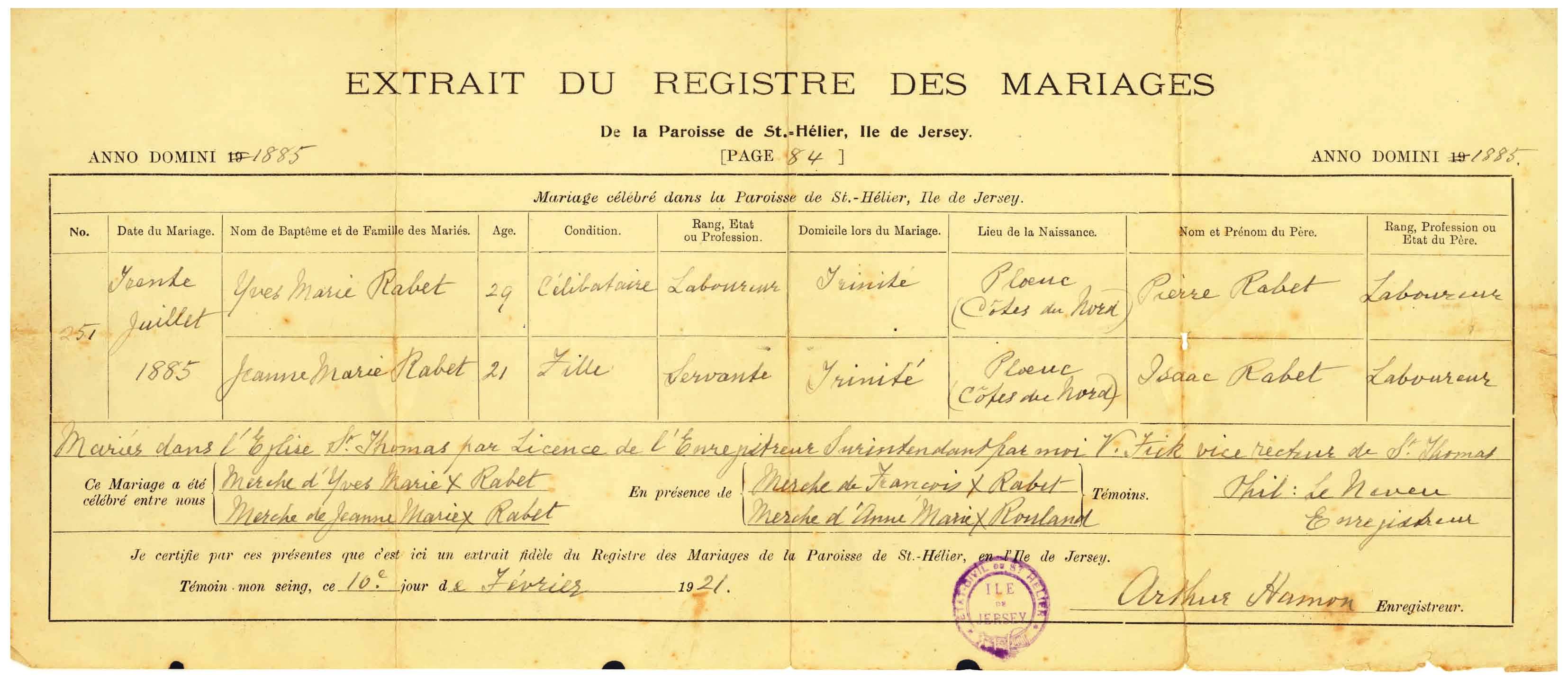1885 – Jeanne marries Yves Rabet (a Labourer also born in Ploeuc) in St. Helier, Jersey, Channel Islands in the presence of Francois Rabet & Marie Rowland.
