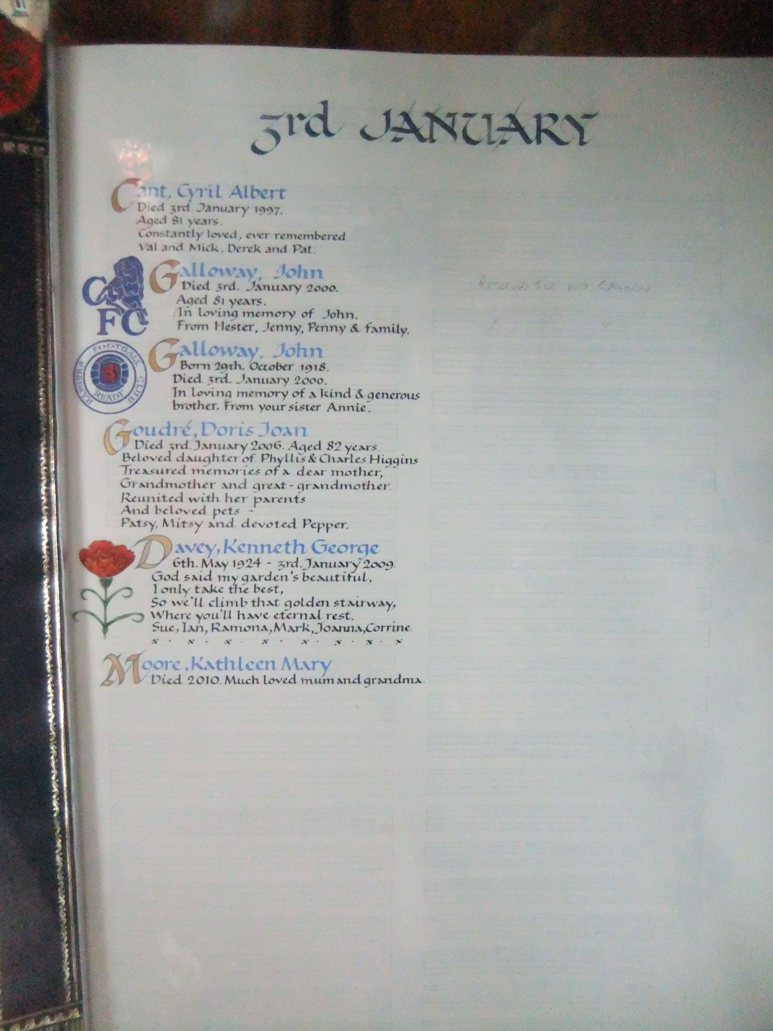 Although I have returned to the island for Christmas and to catch up with friends and family I also have a long ‘to do’ list of family tree research. One of the items on the list was to visit the crematorium in Westmount Road, St. Helier. My mother laid some flowers on my grandmother Grace Davey’s resting place (Ken’s wife) and I took a photo of the Remembrance book.