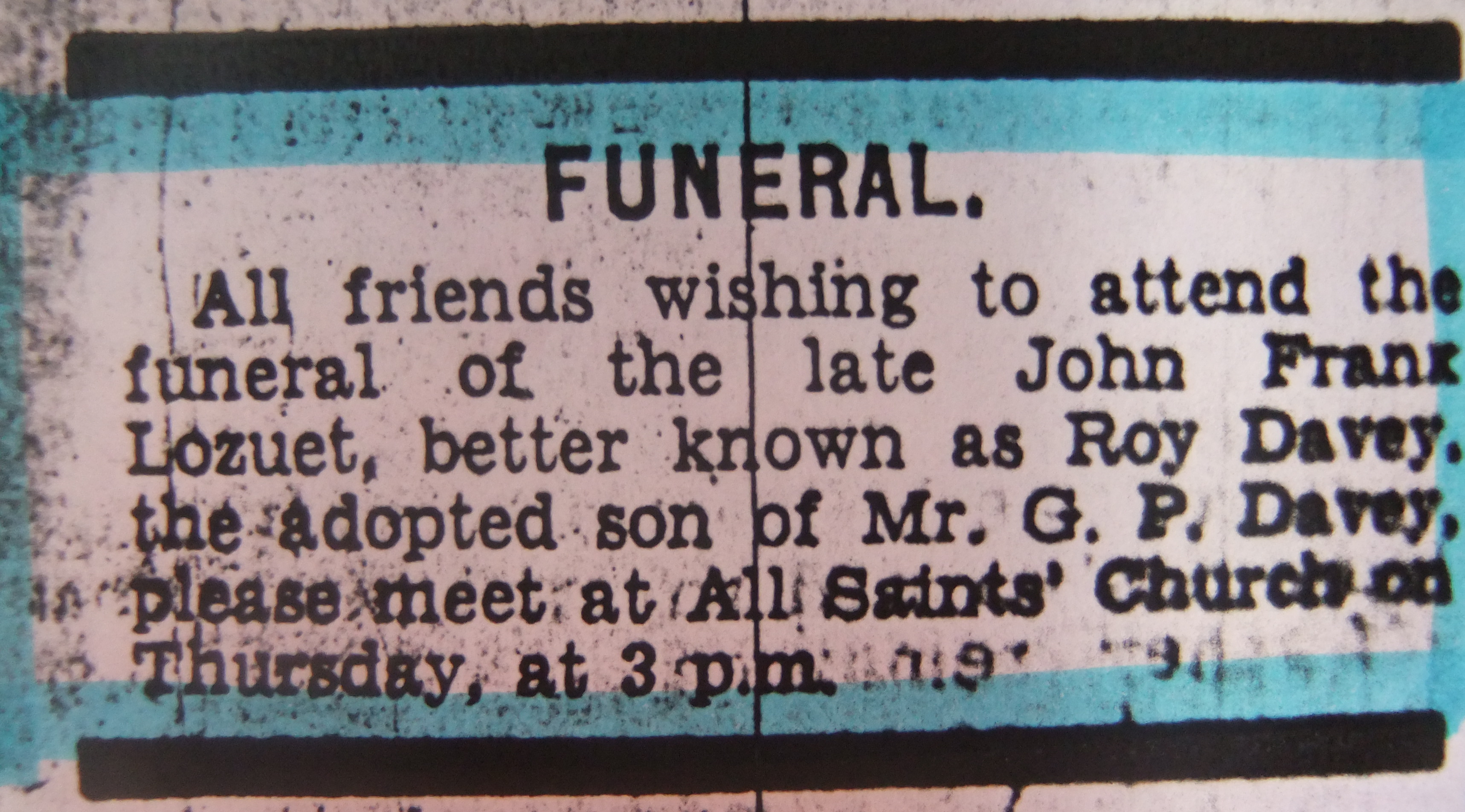 - John was known by two names firstly John Frank Edwin Lozuet, but mainly as Roy Davey. It is very important to find out if ancestors had nicknames when researching your family tree.