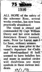 The above picture is a cut out from the Temps Passe Section in the local newspaper in Jersey called the Jersey Evening Post or otherwise known as the ‘J.E.P.’ It was this little piece of history from 1916 that started my quest into my family history. Being a ‘Davey’ myself I was curious to find out if I was related to Captain William Davey. I have yet to find out the exact connection. As you can see I cut the piece out of the paper on the 17th January 1991.